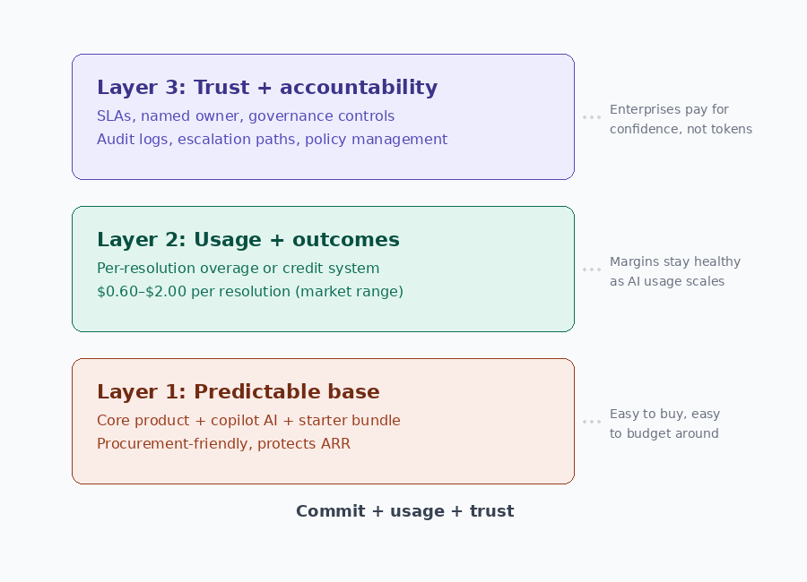 A hybrid model sidesteps this argument instead of picking a side. The base subscription gives you the budget predictability that conversation-based advocates care about. The variable layer gives you the value alignment that resolution-based advocates care about. The premium tier handles governance and accountability, which neither model addresses well on its own.