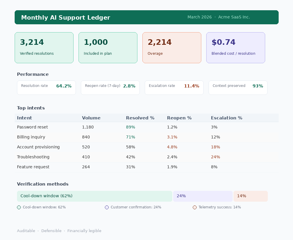 A resolution ledger is a monthly report that answers what was resolved, why each one counted, what evidence backs it up, what reopened, and what got escalated. It's not just a billing document. It's the thing that turns "we resolved your tickets with AI" into something a finance team can actually verify.